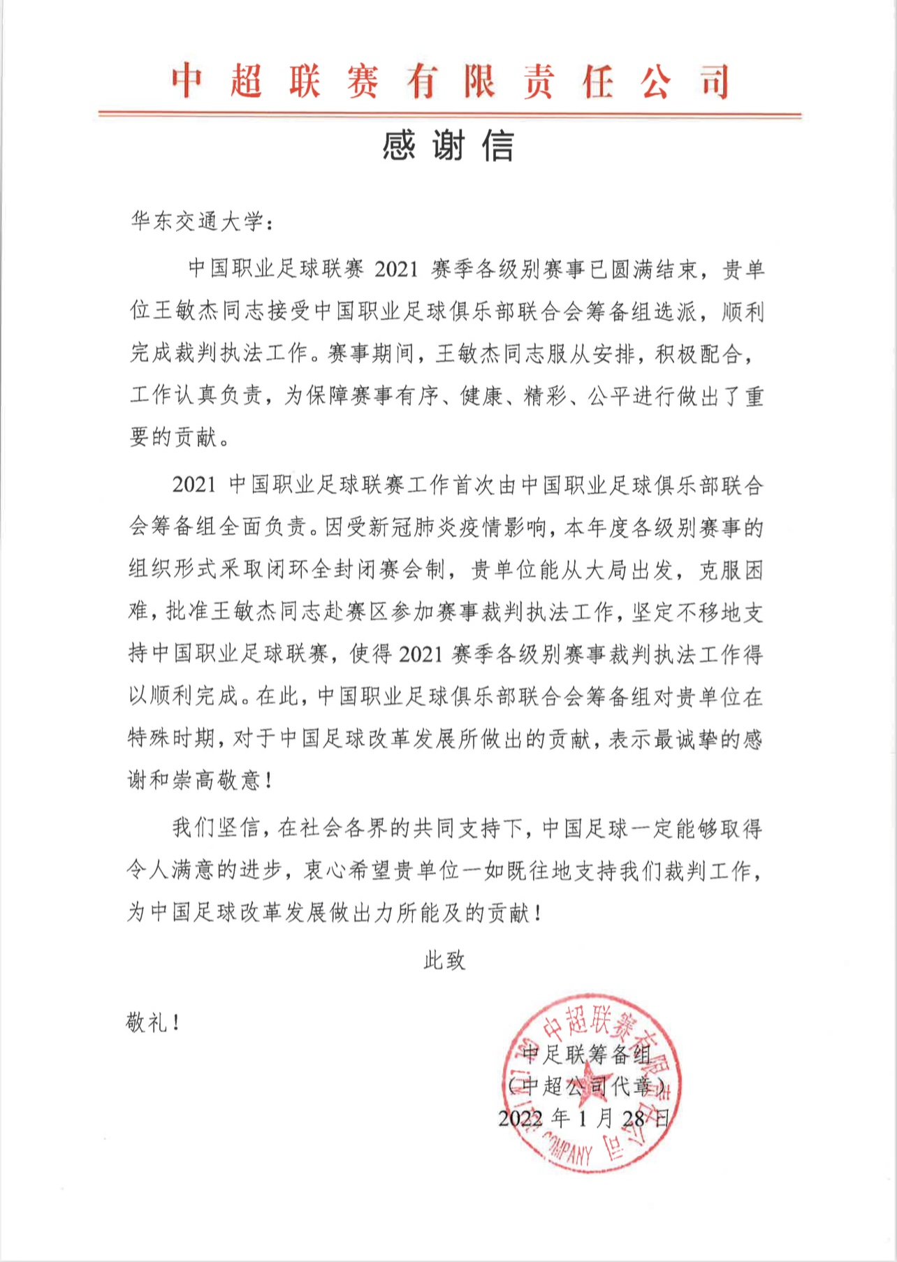 从大局出发,克服困难,批准王敏杰赴赛区参加赛事裁判执法工作,坚定不移地支持中国职业足球联赛,使得 2021 赛季各级别赛事裁判执法工作得以顺利完成。