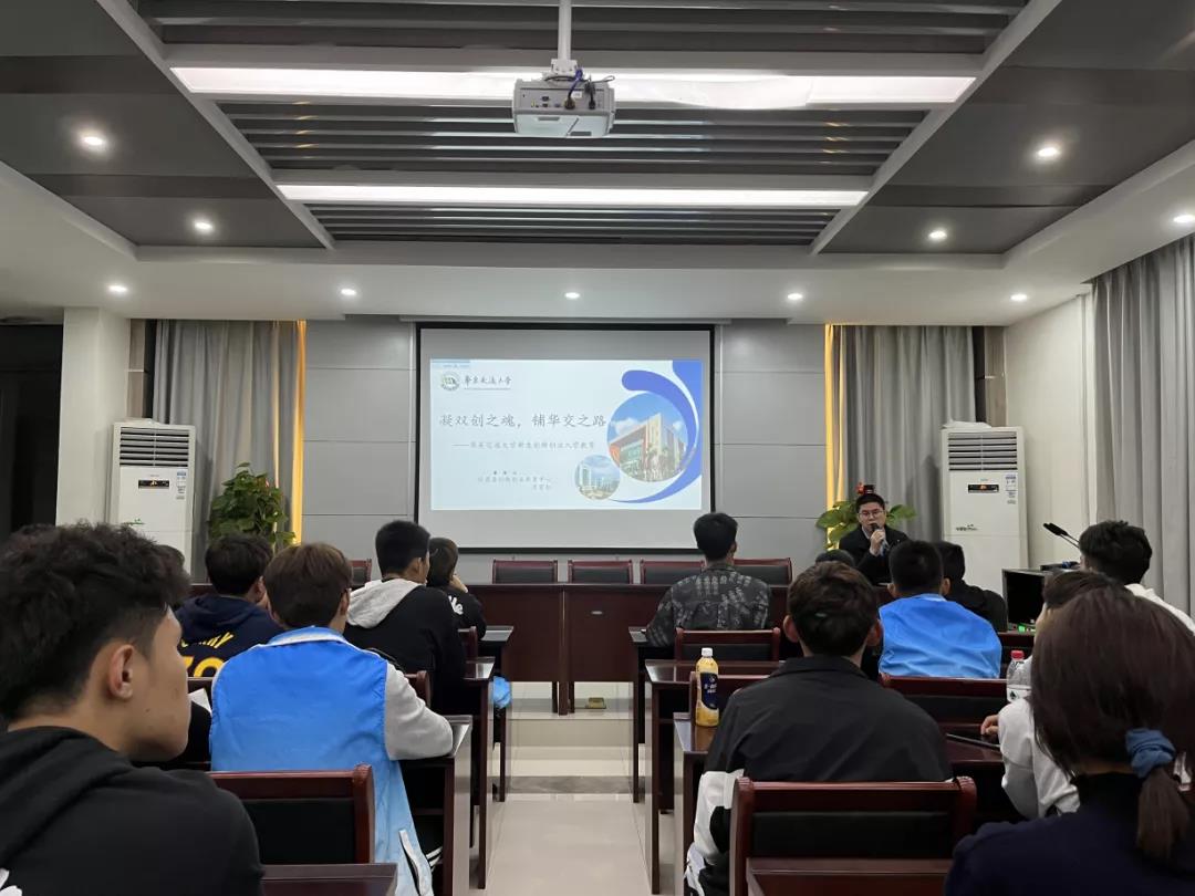 于北区学院一楼会议室开展了以“凝双创之魂,铺华交之路”为主题的创新创业新生入学教育。此次讲座由校团委双创中心委托万家红老师做汇报与分享。